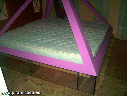 La pirámide propiamente dicha es como la Piramicama normal, de aluminio de alta pureza en ángulos piramidales perfectos. Toda la estructura base está compuesta de tableros de plástico transparente de alta resistencia al impacto, con 12 mm de espesor. El somier es de lamas curvas, con las medidas exactas para que no se mueva el colchón, que también es de perfecto encaje en la estructura.