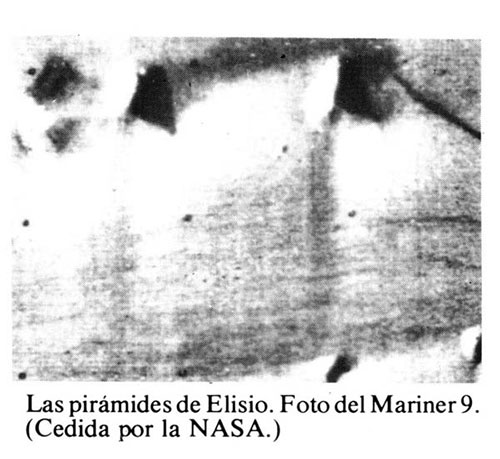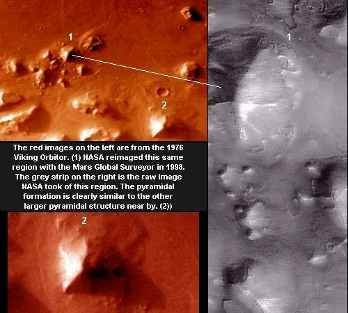 Y como si fueran pocas en la Tierra, las tenemos vistas en Marte y la Luna, aunque la NASA diga ahora que son montajes, ilusiones, juegos de luces y sombras... Para tapar las causas de ¿Por qué hacen la Guerra, los Señores del Mundo, en vez de Explorar el Espacio? Creo que no nos dejan visitar esas pirámides. Simplemente eso... (Por ahora) nos conformaremos con las fotos de Marte y la Luna, donde las pirámides son indiscutiblemente artificiales, pues ningún proceso de erosión puede hacer esas formas. La erosión eólica (la principal en Marte), redondea, forma colinas a partir de cualquier cuerpo angulado.